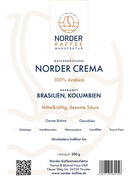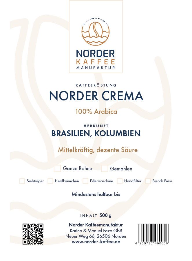Der Norder Crema ist eine aromatische Röstung zwischen Kaffee- und Espresso. Speziell entwickelt und geröstet für den Crema aus dem Vollautomaten: mittelkräftig, voll im Geschmack mit einer dezenten Säure. Gefiltert ergibt unser Crema eine eher kräftigere Tasse Kaffee. Selbstverständlich lässt sich auch durch den Siebträger ein leckerer Crema herstellen, einfach die Bohnen ein wenig gröber mahlen.